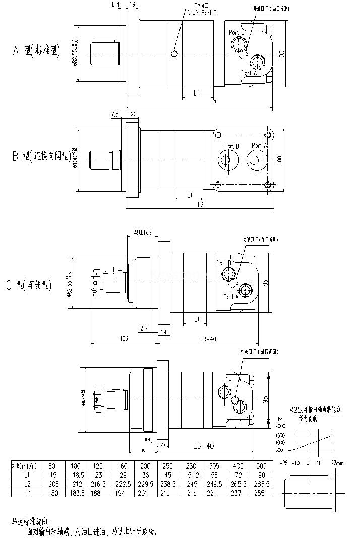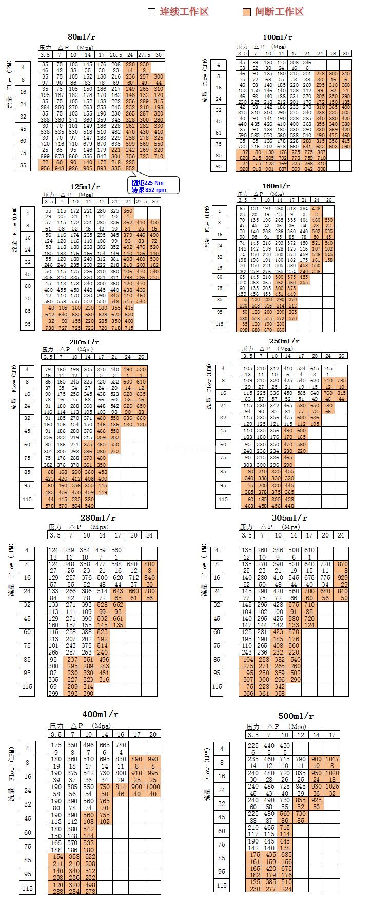 表中數(shù)據(jù)在使用68#抗磨液壓油,50℃ 油溫條件下測試的,不同馬達結(jié)果略有差別